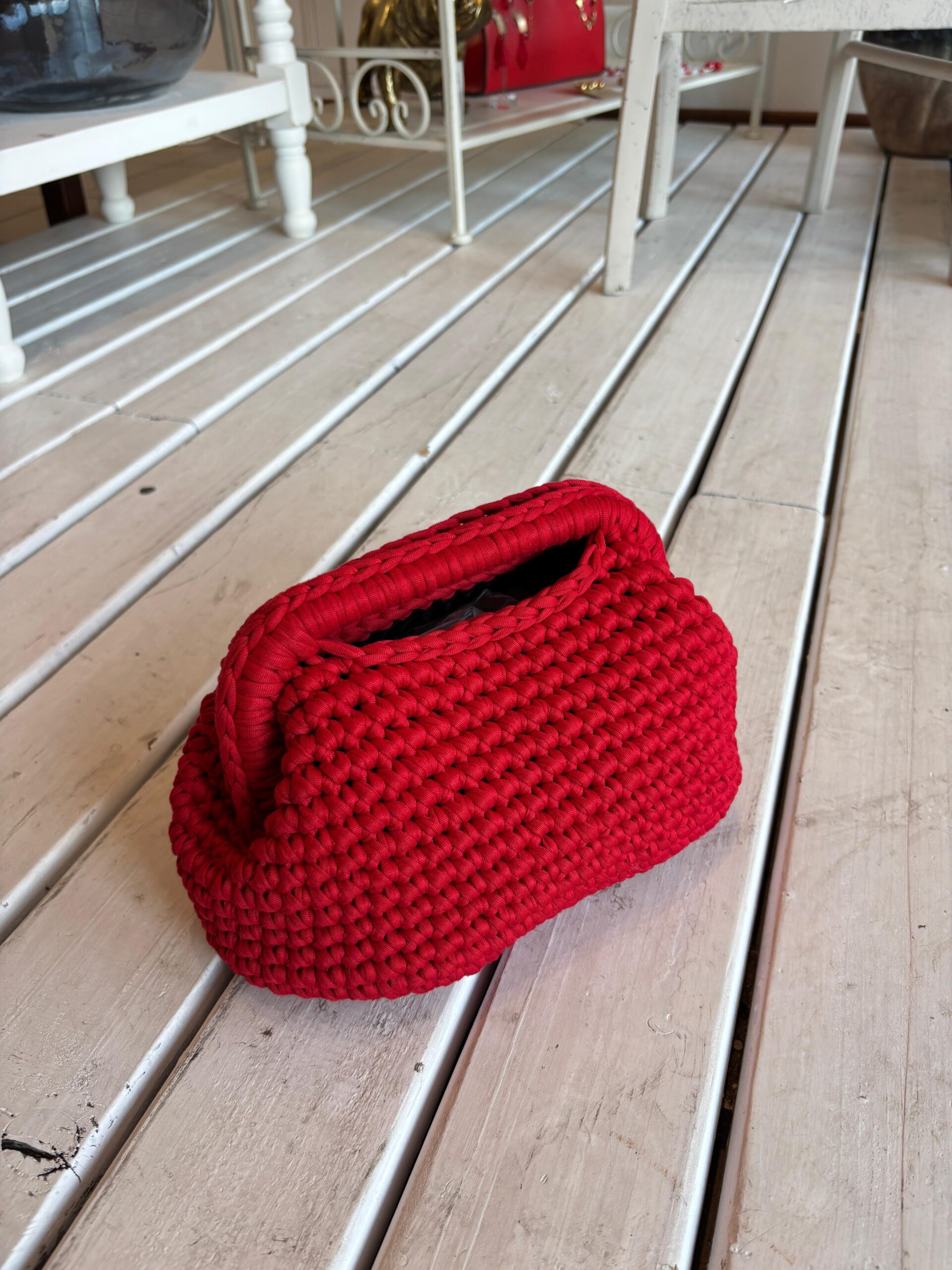 Borsa fatta a mano con interno foderato e manico rigido.